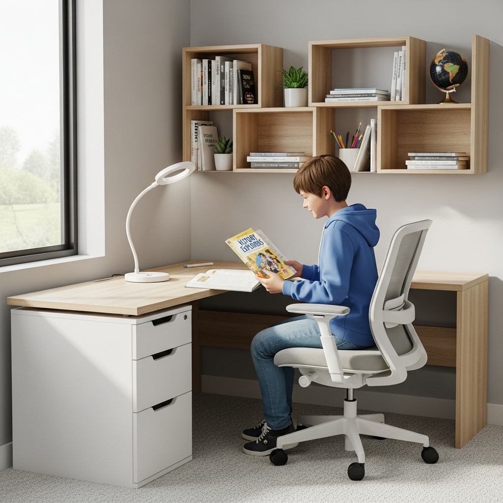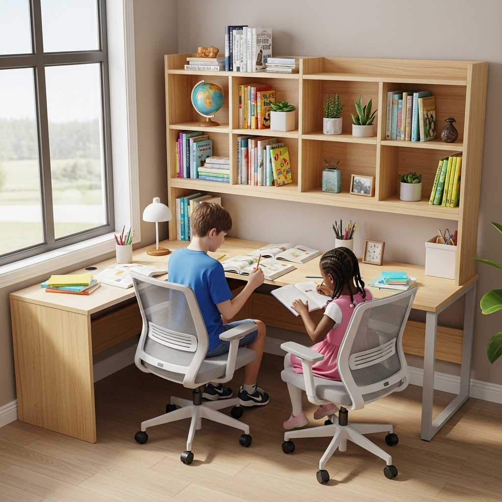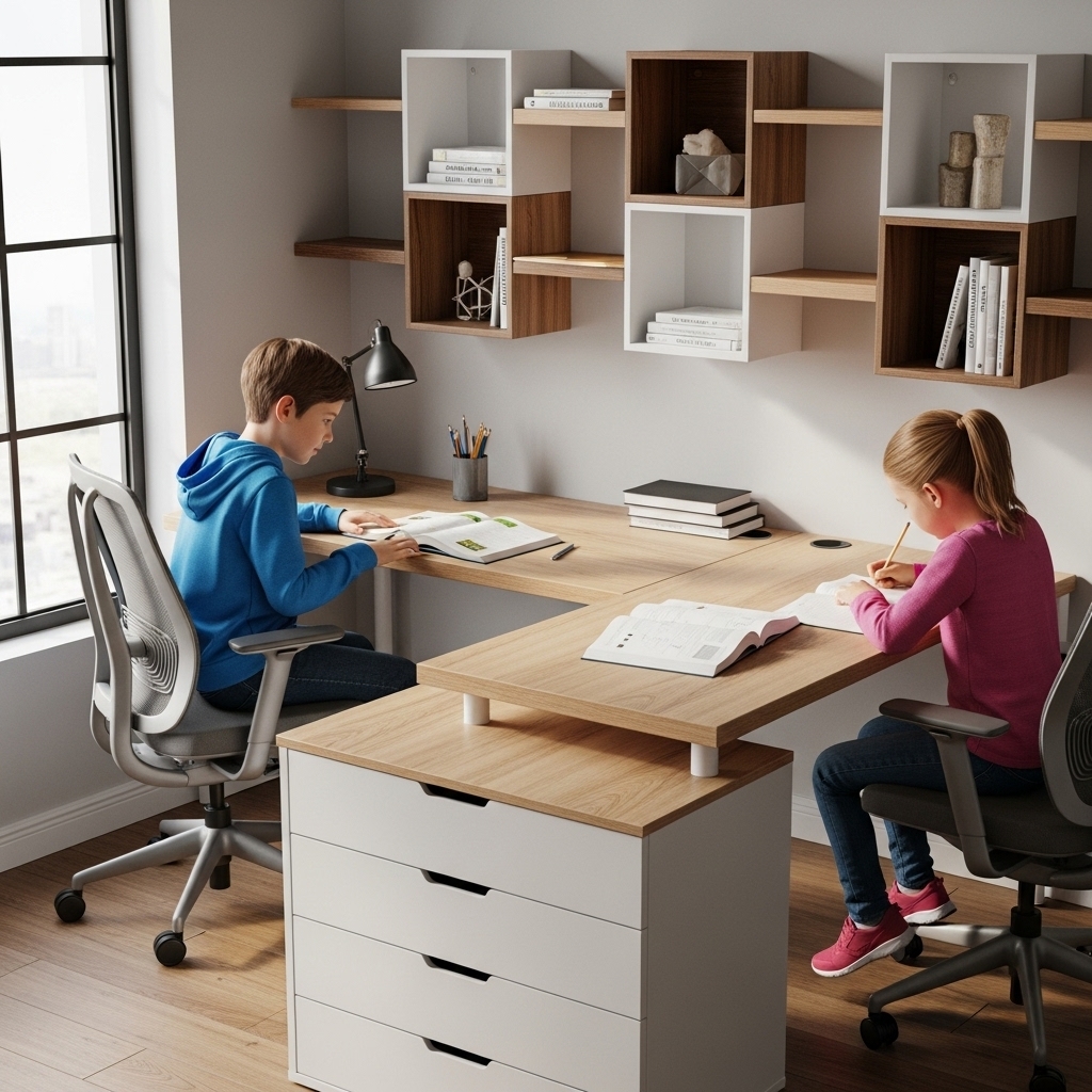 Thiết kế thông minh: Bàn học có kiểu dáng chữ L, giúp tối ưu hóa không gian làm việc và học tập, đặc biệt phù hợp cho các phòng có diện tích nhỏ.