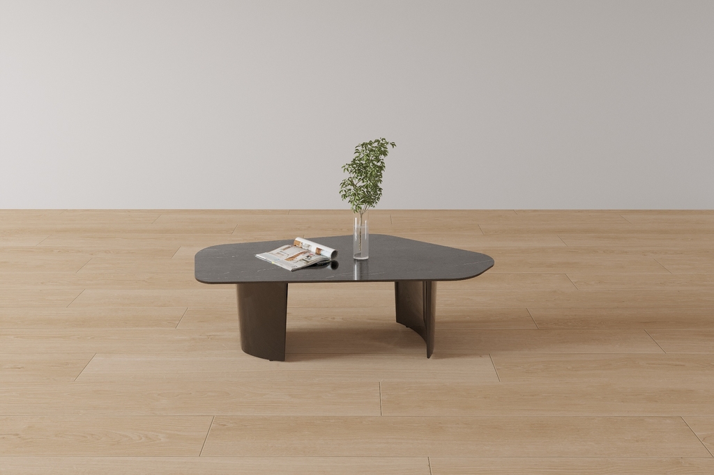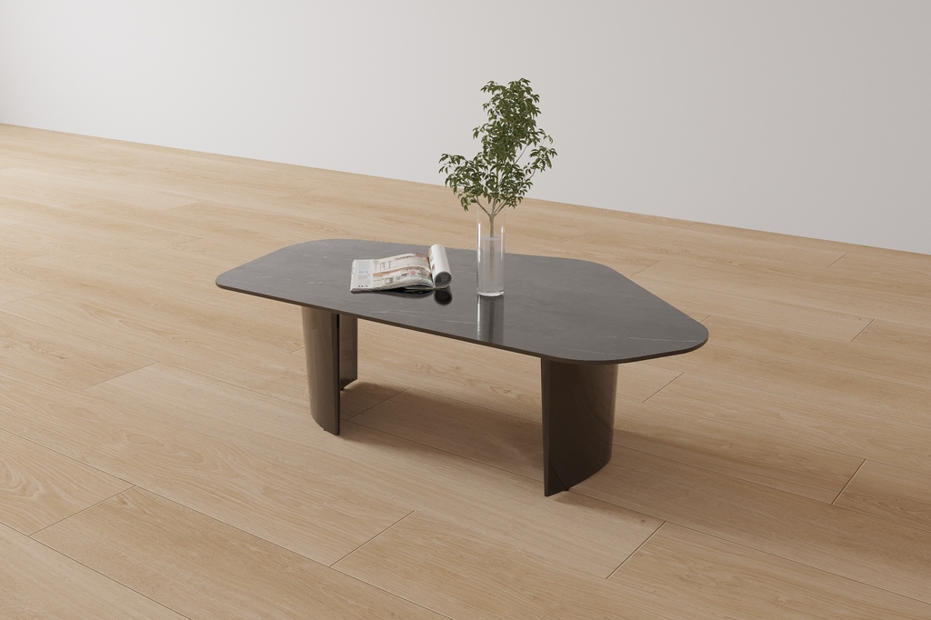 Hình dáng: Mặt bàn có hình dạng độc đáo, là một khối đa giác với các cạnh được bo tròn nhẹ nhàng. Sự bo tròn này không chỉ tạo vẻ mềm mại, thanh thoát mà còn tăng tính an toàn, loại bỏ hoàn toàn các góc sắc nhọn gây nguy hiểm.
