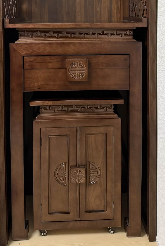 Tủ Cơm (Bàn Phụ): Tủ cơm được thiết kế tích hợp, có thể kéo ra, với kích thước chuẩn phong thủy để đảm bảo sự trang trọng và tiện lợi khi đặt mâm cỗ cúng gia tiên.