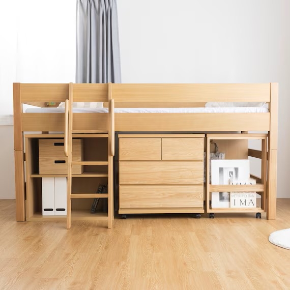 Hệ bàn học & Tủ ngăn kéo chứa đồ linh hoạt: Điểm nổi bật là bàn học và tủ ngăn kéo không cố định mà được thiết kế tách rời, trang bị chân có bánh xe kéo (casters). Điều này cho phép người dùng dễ dàng kéo bàn và tủ ra ngoài khi cần sử dụng cho việc học tập, làm việc, hoặc sắp xếp đồ đạc. Sau khi dùng xong, chúng có thể đẩy gọn gàng vào gầm giường để giải phóng không gian sinh hoạt, mang lại sự linh hoạt tối đa và tối ưu hóa không gian cho các hoạt động khác trong phòng. Tủ ngăn kéo cung cấp không gian lưu trữ kín đáo, giúp giữ đồ đạc luôn gọn gàng.