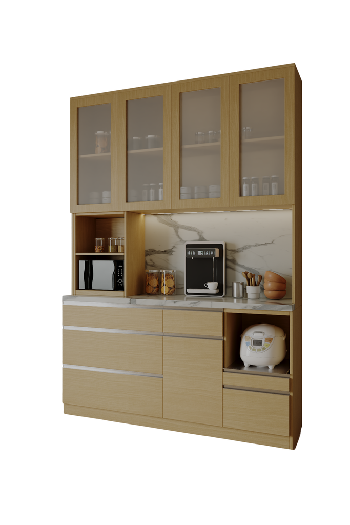 Khu vực Tủ Nóc (Trên): Hệ thống cánh kính mờ lý tưởng để lưu trữ chén đĩa, ly tách hoặc các hũ gia vị khô, giữ cho chúng luôn sạch sẽ và dễ tìm kiếm.