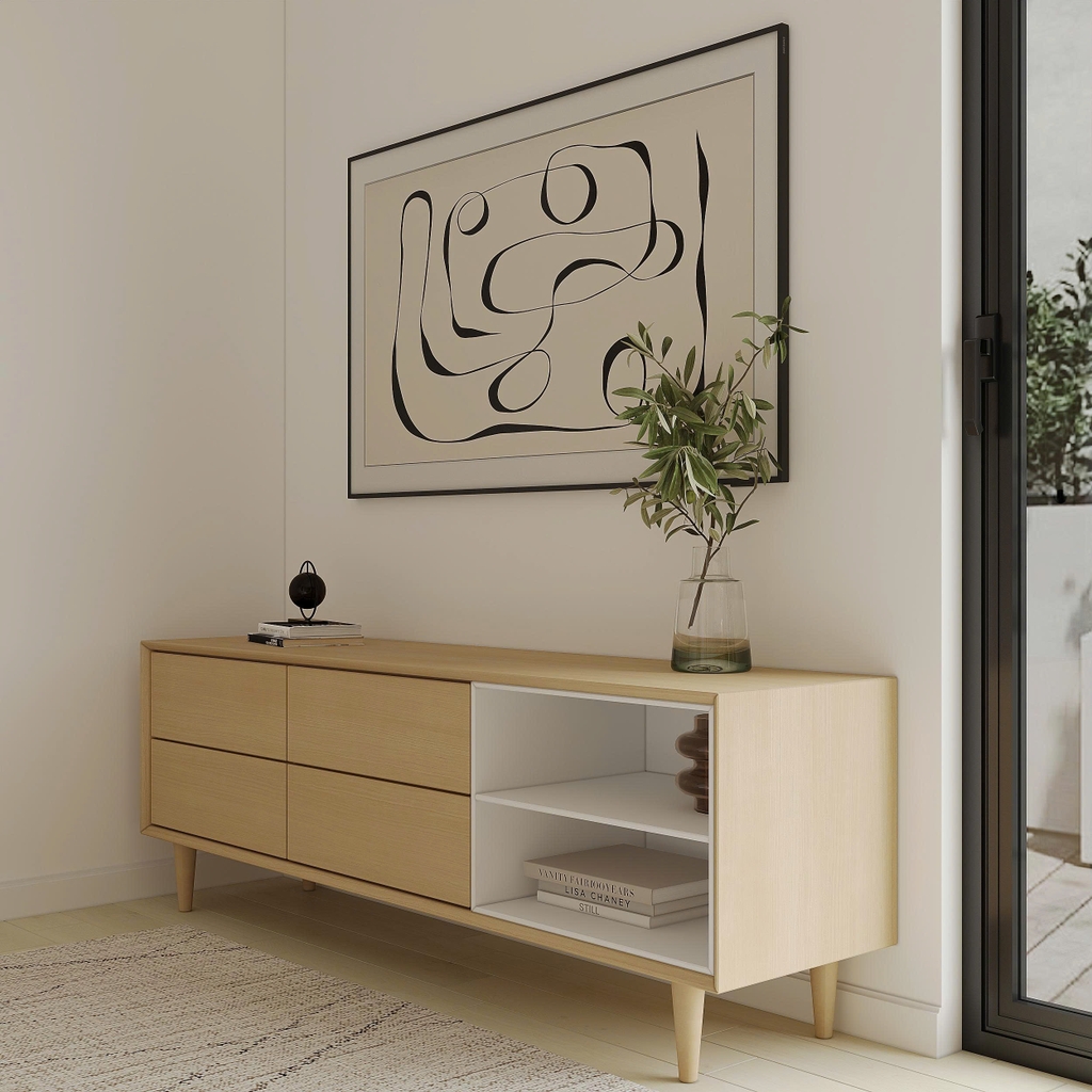 Kệ TV2501 Tối Giản là một khối liền mạch, tối ưu cho nhu cầu lưu trữ và đặt thiết bị: