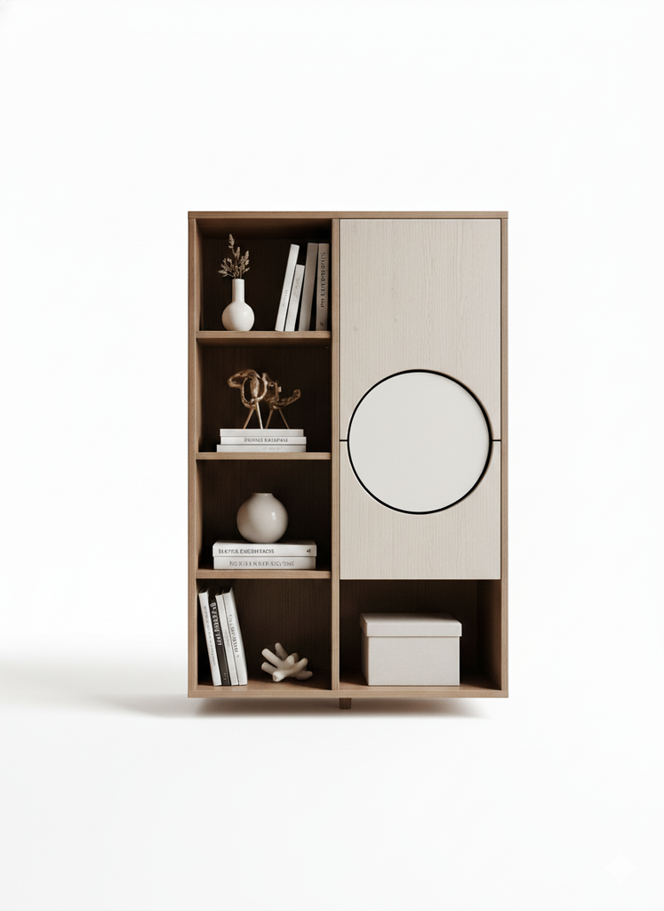 Thiết kế khối: Sự kết hợp giữa hai khối chức năng (kệ TV ngang và tủ đứng) tạo nên bố cục cân đối nhưng không nhàm chán. Đặc biệt, tủ phụ đứng có sự phối hợp giữa hai tông màu gỗ (sáng và tối) và chi tiết hình tròn độc đáo trên cánh tủ, tạo điểm nhấn nghệ thuật ấn tượng.