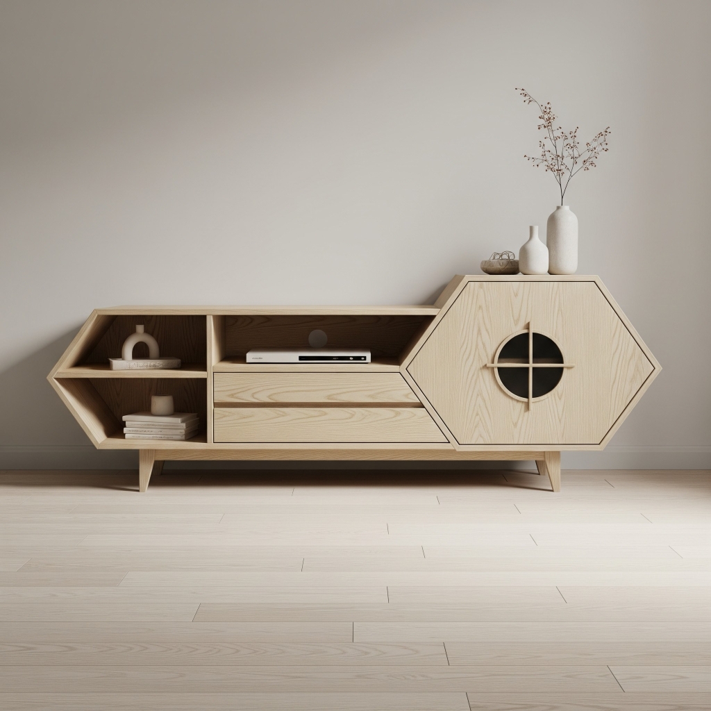 Thiết kế hình học: Điểm độc đáo nhất là hình dáng đa giác cắt xén ở hai bên, tạo cảm giác chuyển động và hiện đại. Tủ phụ bên phải còn được nhấn nhá bằng một ô cửa sổ tròn, mang lại sự tò mò và thú vị về mặt thị giác.